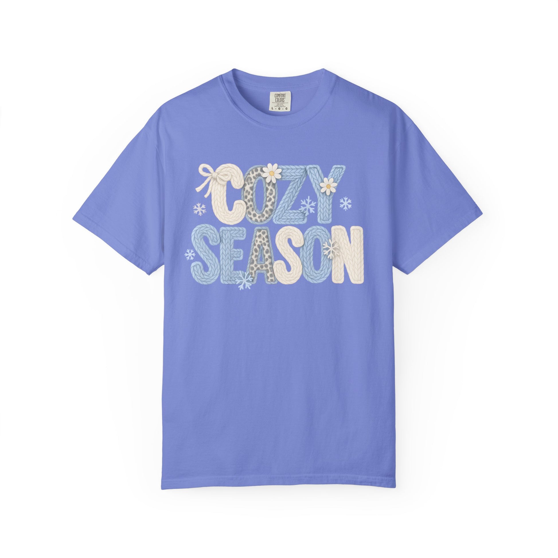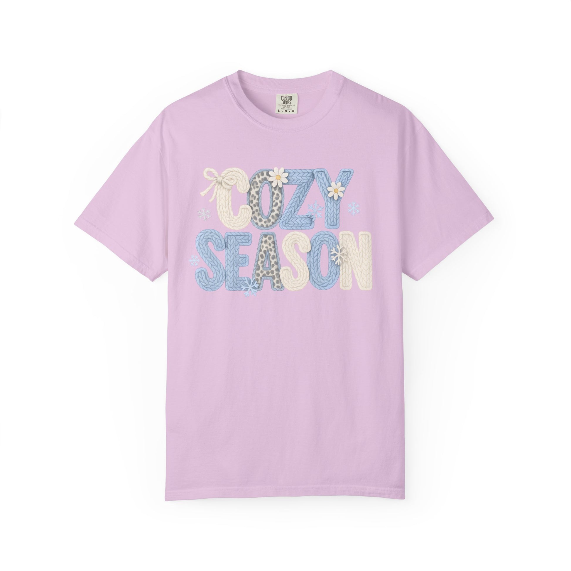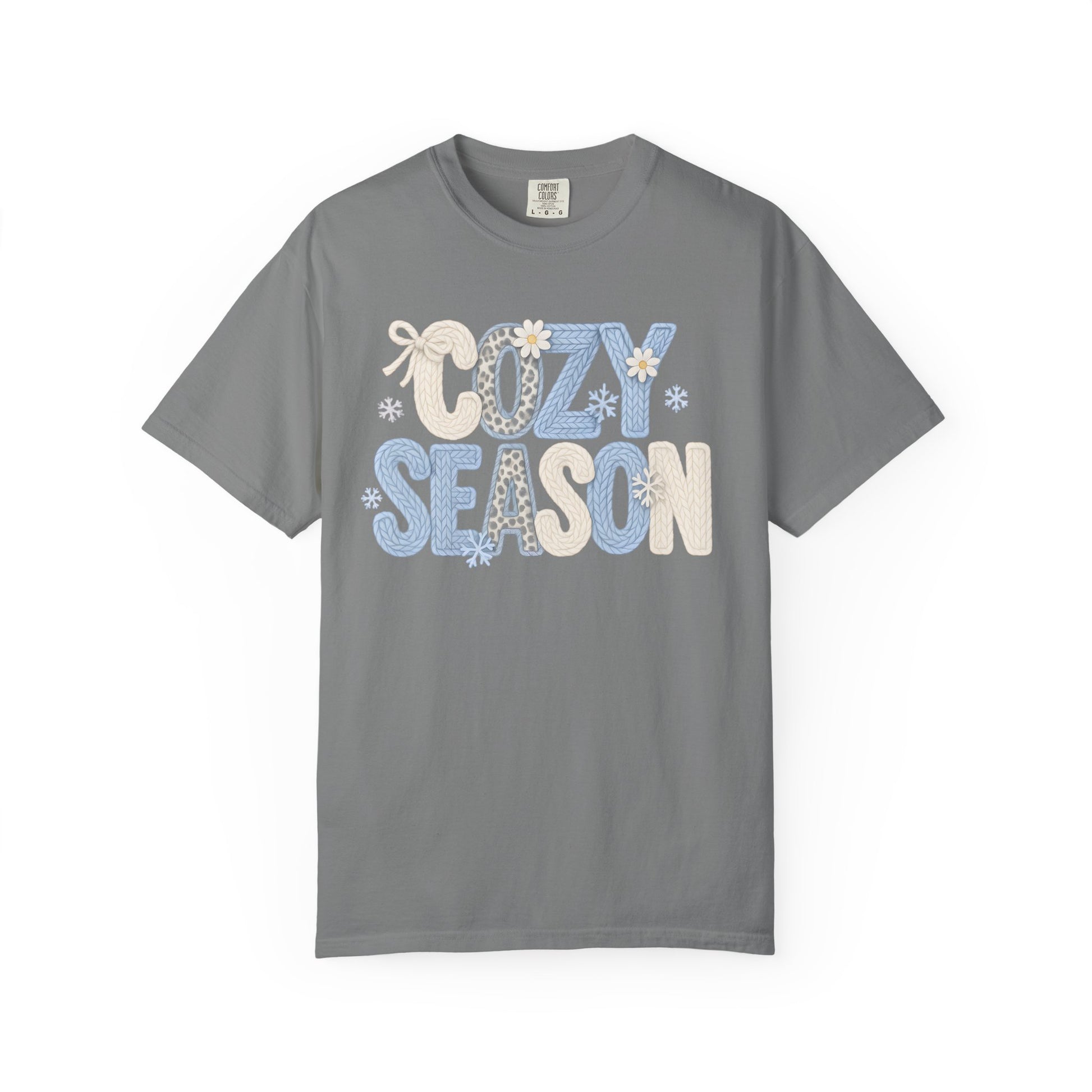 Soft, lived-in cotton with a warm wink — this garment-dyed tee reads “COZY SEASON” in playful patchwork letters, each one textured with subtle knit and snowflake details. It slips on like a favorite hoodie’s softer cousin: relaxed, slightly roomy, and gently faded from the dye process so the print feels integrated, not slapped on. Wear it with leggings by the fire, layered under a flannel on chilly mornings, or alone when you want a low-effort cozy look that still feels curated. The mid-weight fabric and pre-shrunk ring-spun cotton settle into comfortable shape wash after wash, and the tubular knit keeps the silhouette clean and simple. For people who collect slow mornings, steaming mugs, and quiet nights in, this tee brings that mood into everyday wear.